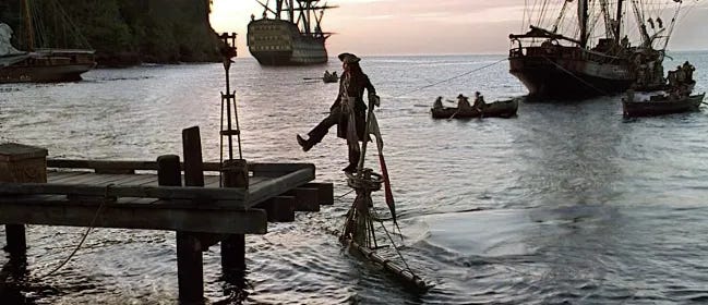 That’s why- when the dock is slowly sinking into Port Royal, he’s proudly walking on to the dock as if it was his plan all along.